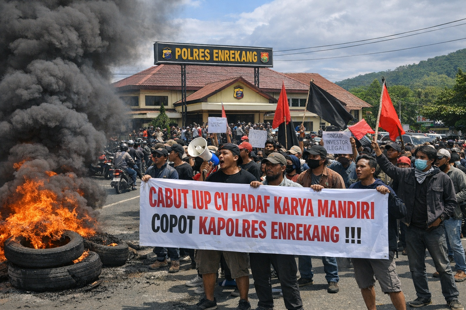 Enrekang – Aliansi Masyarakat Lingkar Tambang menggelar aksi unjuk rasa di depan Polres Enrekang, Senin (16/03/2026). Massa aksi menuntut aparat kepolisian segera menangkap pihak investor yang diduga melakukan aktivitas ilegal di lahan masyarakat serta mendesak pencopotan Kapolres Enrekang dan pencabutan Izin Usaha Pertambangan (IUP) milik CV Hadaf Karya Mandiri.