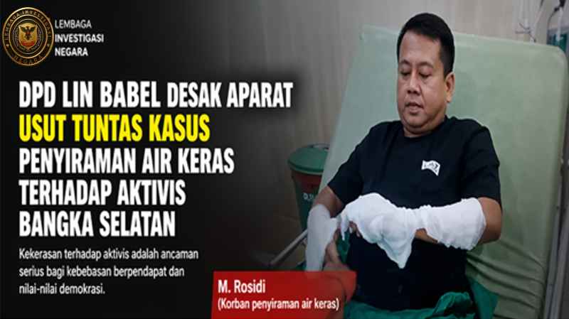 Toboali, Bangka Selatan – Dewan Pimpinan Daerah (DPD) Lembaga Investigasi Negara (LIN) Bangka Belitung mendesak aparat penegak hukum untuk segera mengusut tuntas kasus penyiraman air keras terhadap aktivis kemanusiaan, Muhammad Rosidi.