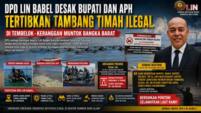BANGKA BARAT – Dewan Pimpinan Daerah Lembaga Investigasi Negara (DPD LIN) Bangka Belitung mendesak Pemerintah Kabupaten Bangka Barat bersama aparat penegak hukum (APH) untuk segera turun tangan menertibkan ratusan aktivitas tambang timah ilegal di perairan Tembelok–Keranggan, Kecamatan Muntok.
