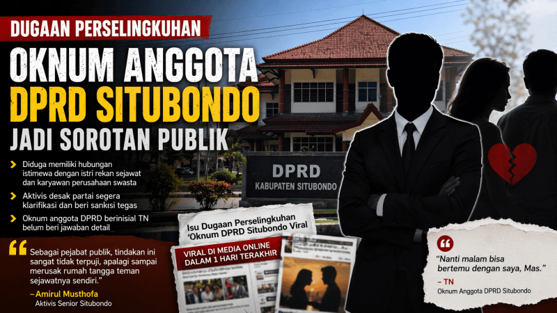 Situbondo – Isu dugaan perselingkuhan yang menyeret salah satu anggota DPRD Kabupaten Situbondo berinisial TN terus menjadi sorotan publik. Dalam 24 jam terakhir, kabar ini kian viral di berbagai media online dan media sosial, memicu gelombang reaksi keras dari masyarakat yang menuntut transparansi serta tindakan tegas dari pihak terkait.