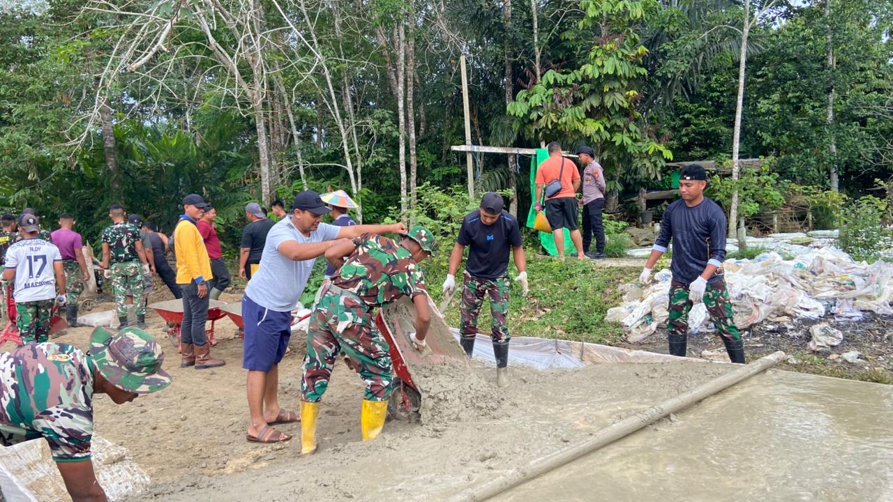 Meski pekerjaan belum sepenuhnya selesai, progres di lapangan menunjukkan perkembangan yang signifikan. Personel Satgas bersama warga tetap kompak mengangkat material, mengaduk semen, hingga meratakan cor beton agar hasilnya maksimal dan sesuai dengan spesifikasi yang telah direncanakan.