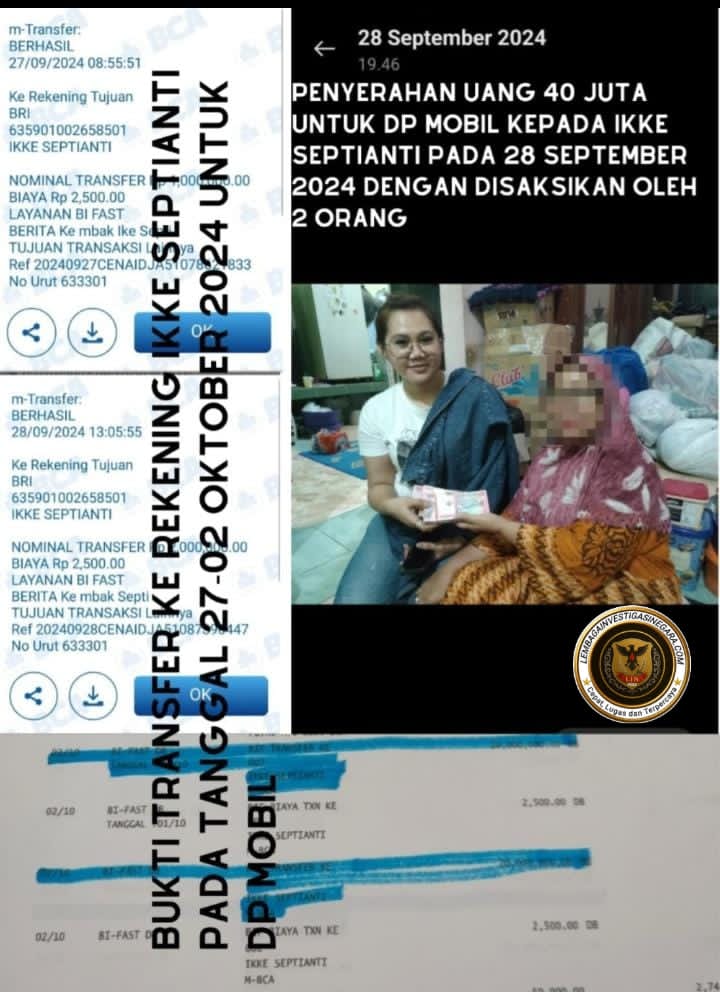 “Selain diberikan cash, uang muka dibayar via transfer bertahap ke rekening atas nama Ikke Septianti. Saya ingatkan, jangan sampai membuat laporan palsu, karena ada deliknya jika klien kami dirugikan,” tegas Dodik Firmansyah.
