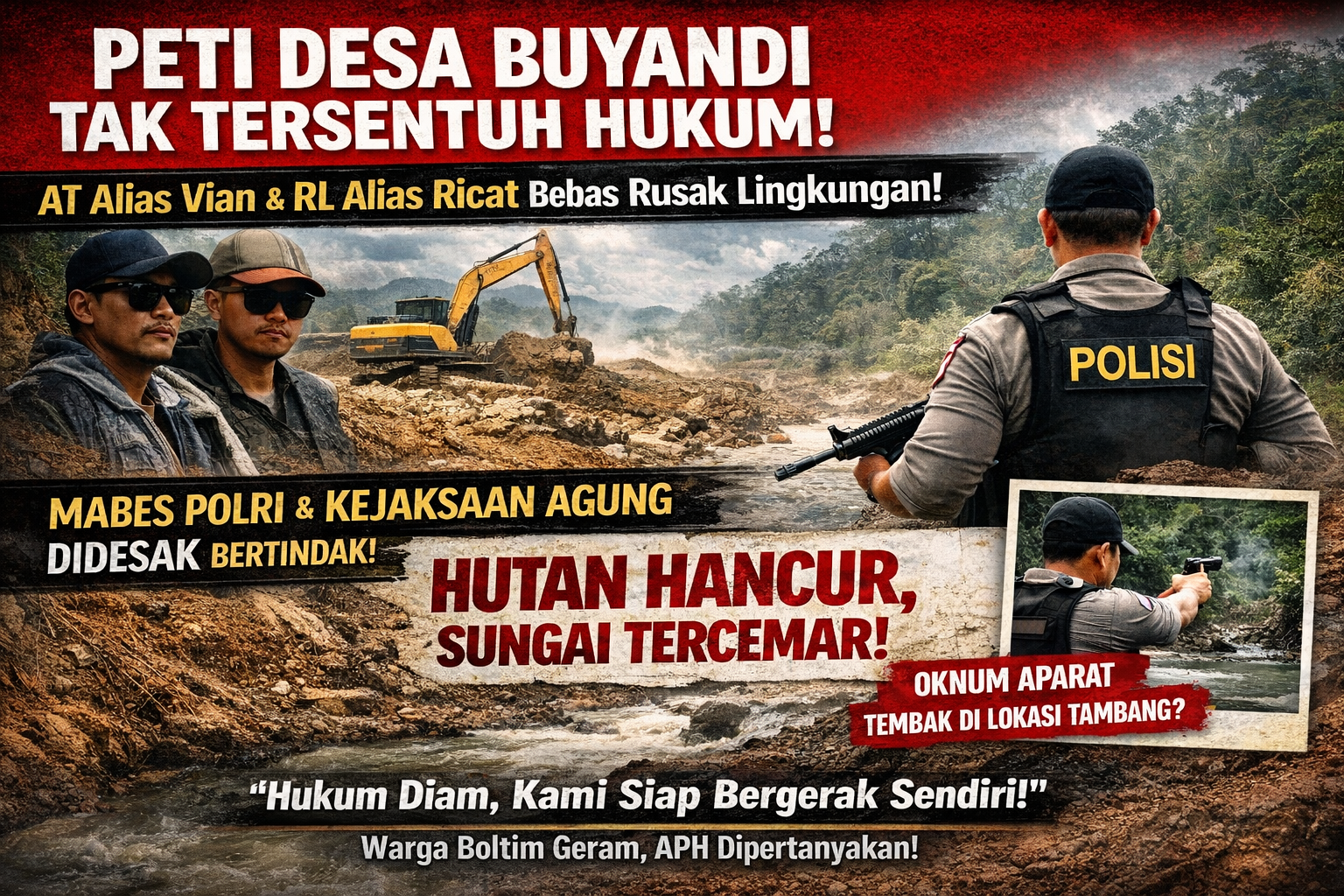 Bolaang Mongondow Timur (Boltim) – Wibawa hukum di Kabupaten Bolaang Mongondow Timur kembali dipertanyakan. Aktivitas Pertambangan Tanpa Izin (PETI) yang diduga kuat dilakukan oleh AT alias Vian dan RL alias Ricat di Desa Buyandi hingga kini masih berlangsung bebas, seolah tanpa pengawasan dan penindakan dari aparat penegak hukum.