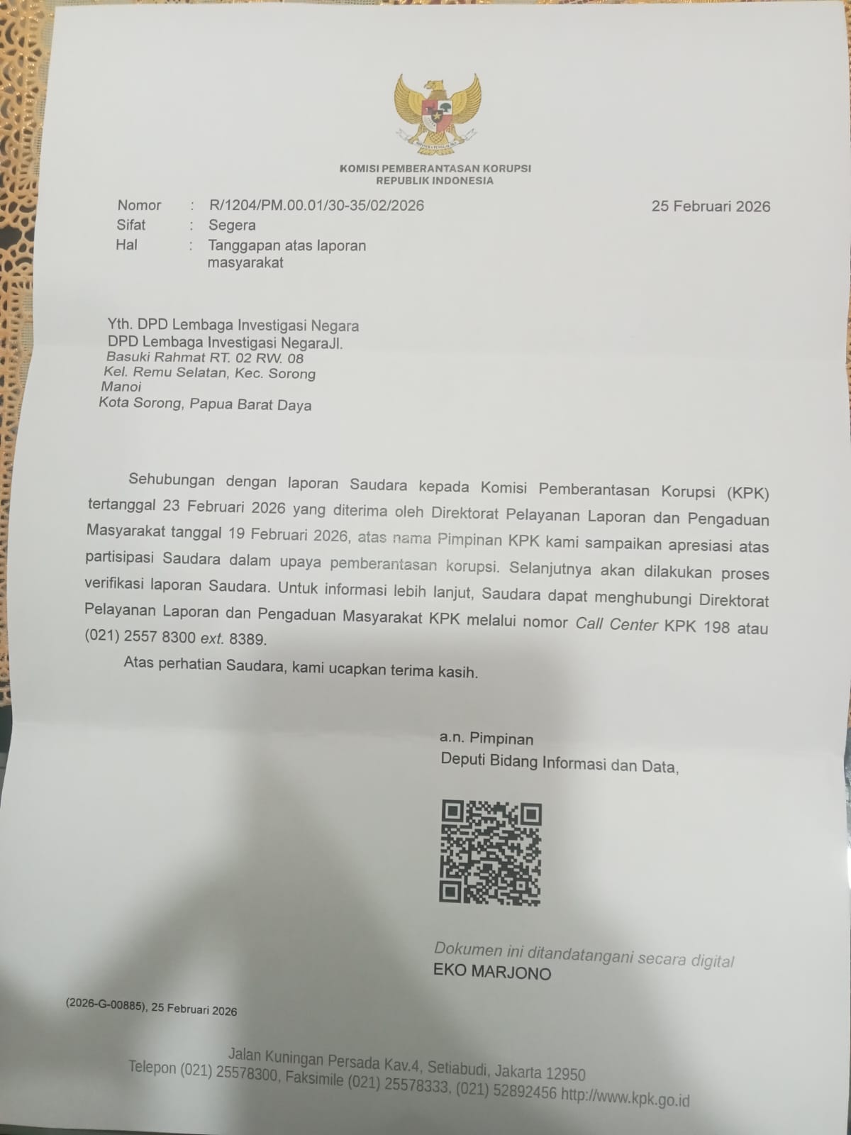 Perkembangan terbaru, Komisi Pemberantasan Korupsi (KPK) pada 25 Februari 2026 telah mengirimkan surat konfirmasi dan tanggapan resmi kepada DPD LIN Papua Barat Daya terkait laporan dugaan tindak pidana korupsi dana kampung di Sorong Selatan.