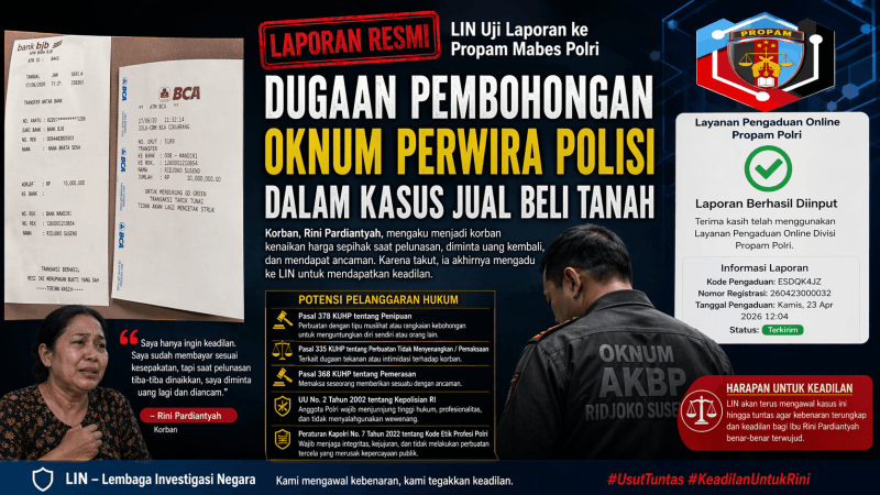 Langkah ini merupakan bentuk keseriusan LIN dalam mengawal dugaan pelanggaran etik dan potensi tindak pidana yang dinilai merugikan masyarakat sipil, khususnya seorang perempuan bernama Rini Pardiantyah, yang mengaku menjadi korban dalam transaksi tersebut.