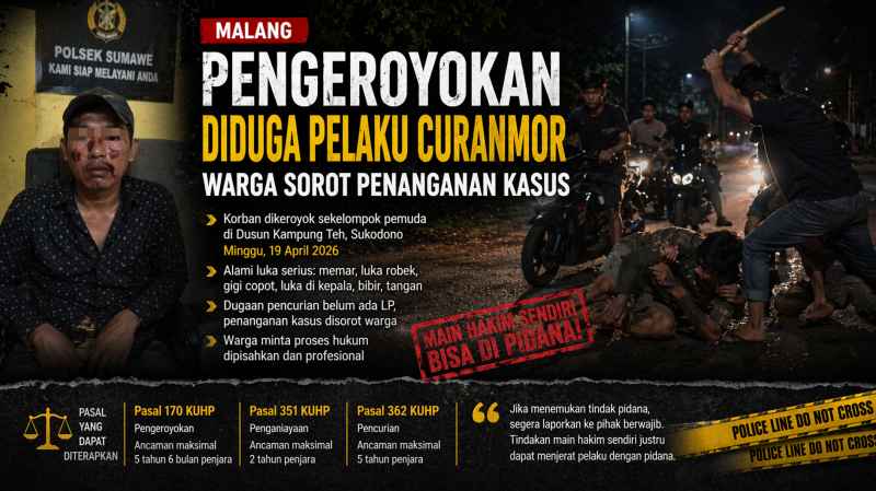 Malang – Dugaan tindak pidana pengeroyokan yang dilakukan sekelompok pemuda terhadap seorang pria berinisial S, yang diduga sebagai pelaku pencurian sepeda motor, kini menjadi sorotan warga di Desa Sukodono, wilayah hukum Polsek Dampit, Kabupaten Malang.