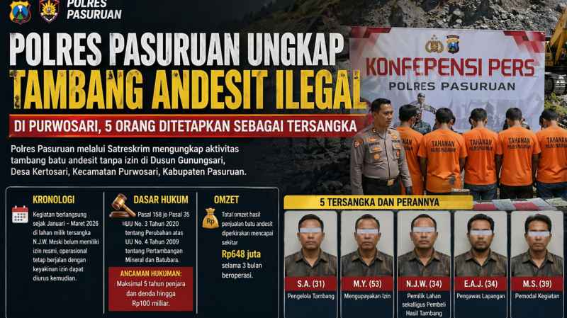 Kasus ini bermula dari laporan polisi Nomor LP/A/8/III/2026/SPKT.SATRESKRIM/POLRES PASURUAN/POLDA JAWA TIMUR tertanggal 9 Maret 2026. Setelah dilakukan penyelidikan, polisi menetapkan lima orang tersangka yang diduga terlibat dalam kegiatan penambangan tanpa izin tersebut.