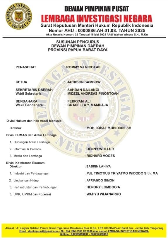 Sorong (PBD) — Gonjang-ganjing internal di tubuh DPD Lembaga Investigasi Negara (LIN) Papua Barat Daya akhirnya terjawab. Setelah kursi ketua dibiarkan kosong usai pengunduran diri Andrew Warmasen, Dewan Pimpinan Pusat (DPP) LIN bergerak cepat dan tegas — menunjuk Jackson Sambow sebagai Ketua DPD LIN Papua Barat Daya.