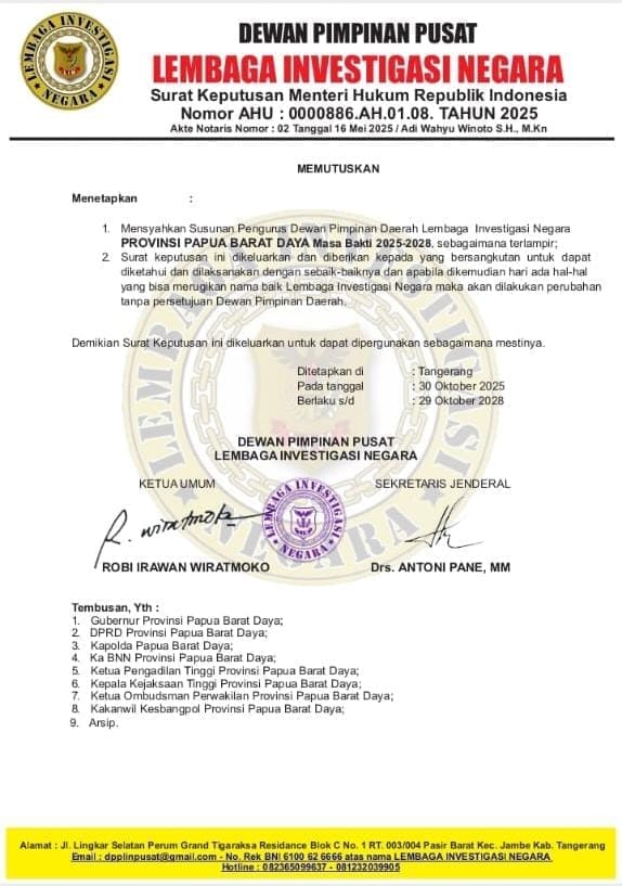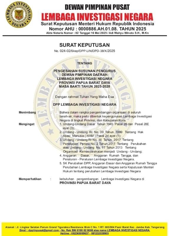 Langkah itu disahkan melalui Surat Keputusan Nomor 024-02/Skep/DPP-LIN/DPD-38/X/2025, yang ditandatangani langsung oleh Ketua Umum Robbi Irawan dan Sekretaris Jenderal DPP LIN di Tangerang pada 30 Oktober 2025, dengan masa jabatan berlaku hingga 29 Oktober 2028.