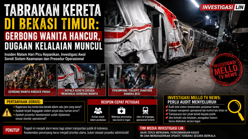BEKASI, –Innalillahi wa inna ilaihi rooji’un.Kecelakaan kereta api yang mengerikan terjadi di Stasiun Bekasi Timur pada Senin malam (27/4) sekitar pukul 21.00 WIB. Sebuah rangkaian kereta dilaporkan ditabrak dari belakang oleh kereta lain, mengakibatkan kerusakan parah pada gerbong paling belakang—yang diketahui merupakan gerbong khusus wanita.
