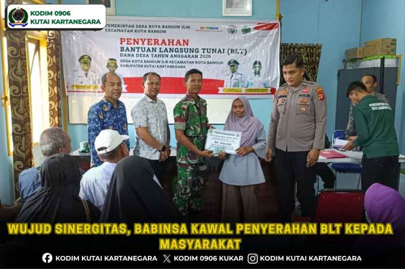 Kutai Kartanegara. lembagainvestigasinegara.com- Dalam rangka memastikan penyaluran Bantuan Langsung Tunai (BLT) dana Desa tahun anggaran 2026 berjalan dengan aman, tertib, dan tepat sasaran, anggota Babinsa Koramil 0906-09/Kota Bangun Koptu Eko bersama Bhabikamtibmas menunjukkan sinergitas yang kuat dalam mengawal proses penyerahan bantuan kepada masyarakat bertempat di kantor Desa Kota Bangun Ilir kecamatan kota Bangun, Minggu 19/4/26.